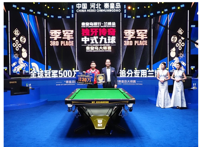 随后,秦皇岛独牙台球控股集团常务副总经理孙涛为季军郑肖淮颁发奖牌、30 万奖金支票及季军奖盘。